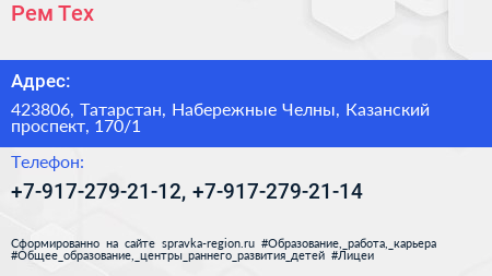 Рем Тех по адресу 423806, Татарстан, Набережные Челны, Казанский проспект, 170/1 в дальнейшем Организация, размещена в следующих категориях: