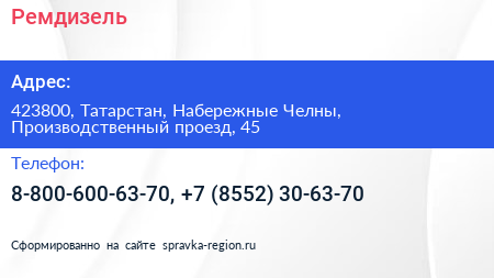 Ремдизель по адресу 423800, Татарстан, Набережные Челны, Производственный проезд, 45 в дальнейшем Организация, размещена в следующих категориях: