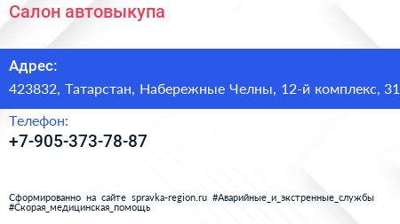 Салон автовыкупа по адресу 423832, Татарстан, Набережные Челны, 12-й комплекс, 31 в дальнейшем Организация, размещена в следующих категориях: