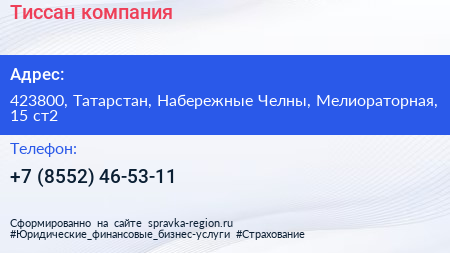 Тиссан, компания по адресу 423800, Татарстан, Набережные Челны, Мелиораторная, 15 ст2 в дальнейшем Организация, размещена в следующих категориях: