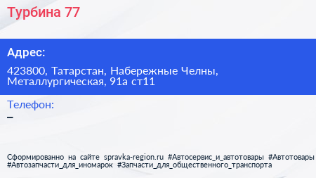 Турбина-77 по адресу 423800, Татарстан, Набережные Челны, Металлургическая, 91а ст11 в дальнейшем Организация, размещена в следующих категориях: