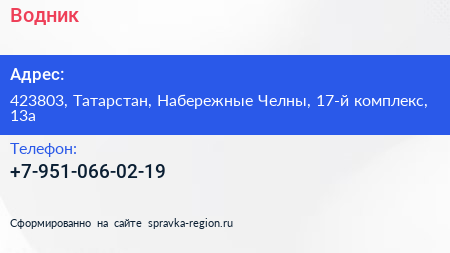 Водник по адресу 423803, Татарстан, Набережные Челны, 17-й комплекс, 13а в дальнейшем Организация, размещена в следующих категориях: