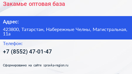Закамье, оптовая база по адресу 423800, Татарстан, Набережные Челны, Магистральная, 11а в дальнейшем Организация, размещена в следующих категориях:
