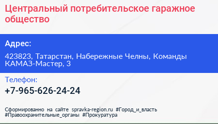 Центральный, потребительское гаражное общество по адресу 423823, Татарстан, Набережные Челны, Команды КАМАЗ-Мастер, 3 в дальнейшем Организация, размещена в следующих категориях: