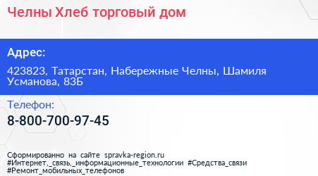 Челны-Хлеб, торговый дом по адресу 423823, Татарстан, Набережные Челны, Шамиля Усманова, 83Б в дальнейшем Организация, размещена в следующих категориях: