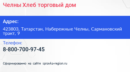 Челны-Хлеб, торговый дом по адресу 423803, Татарстан, Набережные Челны, Сармановский тракт, 9 в дальнейшем Организация, размещена в следующих категориях: