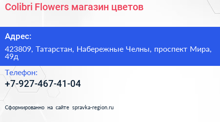 Colibri Flowers, магазин цветов по адресу 423809, Татарстан, Набережные Челны, проспект Мира, 49д в дальнейшем Организация, размещена в следующих категориях: