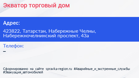 Экватор, торговый дом по адресу 423822, Татарстан, Набережные Челны, Набережночелнинский проспект, 43а в дальнейшем Организация, размещена в следующих категориях: