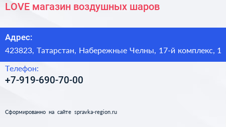 LOVE, магазин воздушных шаров по адресу 423823, Татарстан, Набережные Челны, 17-й комплекс, 1 в дальнейшем Организация, размещена в следующих категориях: