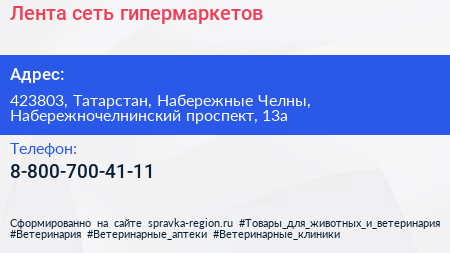 Лента, сеть гипермаркетов по адресу 423803, Татарстан, Набережные Челны, Набережночелнинский проспект, 13а в дальнейшем Организация, размещена в следующих категориях: