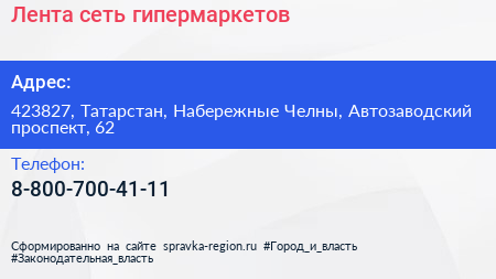 Лента, сеть гипермаркетов по адресу 423827, Татарстан, Набережные Челны, Автозаводский проспект, 62 в дальнейшем Организация, размещена в следующих категориях: