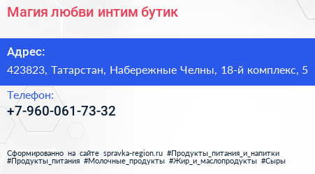 Магия любви, интим-бутик по адресу 423823, Татарстан, Набережные Челны, 18-й комплекс, 5 в дальнейшем Организация, размещена в следующих категориях: