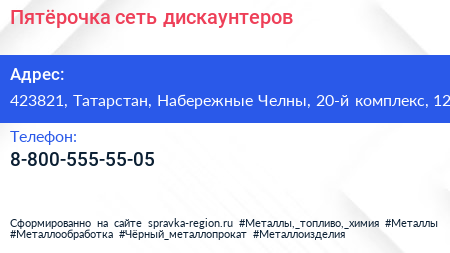 Пятёрочка, сеть дискаунтеров по адресу 423821, Татарстан, Набережные Челны, 20-й комплекс, 12 в дальнейшем Организация, размещена в следующих категориях: