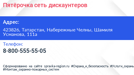 Пятёрочка, сеть дискаунтеров по адресу 423826, Татарстан, Набережные Челны, Шамиля Усманова, 111а в дальнейшем Организация, размещена в следующих категориях: