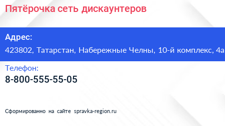 Пятёрочка, сеть дискаунтеров по адресу 423802, Татарстан, Набережные Челны, 10-й комплекс, 4а в дальнейшем Организация, размещена в следующих категориях: