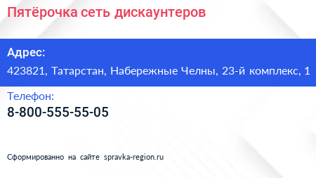 Пятёрочка, сеть дискаунтеров по адресу 423821, Татарстан, Набережные Челны, 23-й комплекс, 1 в дальнейшем Организация, размещена в следующих категориях: