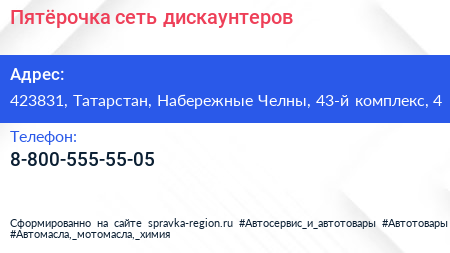 Пятёрочка, сеть дискаунтеров по адресу 423831, Татарстан, Набережные Челны, 43-й комплекс, 4 в дальнейшем Организация, размещена в следующих категориях: