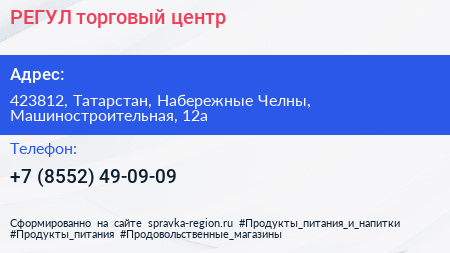 РЕГУЛ, торговый центр по адресу 423812, Татарстан, Набережные Челны, Машиностроительная, 12а в дальнейшем Организация, размещена в следующих категориях: