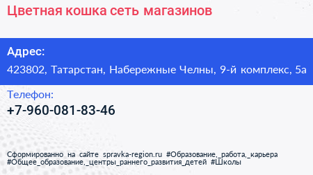 Цветная кошка, сеть магазинов по адресу 423802, Татарстан, Набережные Челны, 9-й комплекс, 5а в дальнейшем Организация, размещена в следующих категориях: