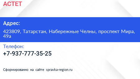 АСТЕТ по адресу 423809, Татарстан, Набережные Челны, проспект Мира, 49а в дальнейшем Организация, размещена в следующих категориях: