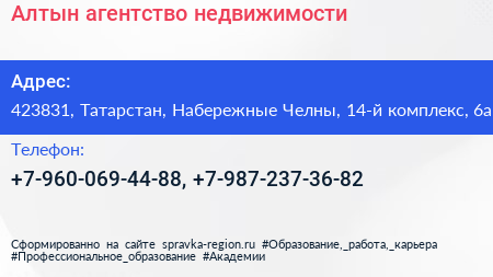Алтын, агентство недвижимости по адресу 423831, Татарстан, Набережные Челны, 14-й комплекс, 6а в дальнейшем Организация, размещена в следующих категориях: