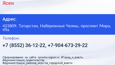Ясен по адресу 423809, Татарстан, Набережные Челны, проспект Мира, 49а в дальнейшем Организация, размещена в следующих категориях: