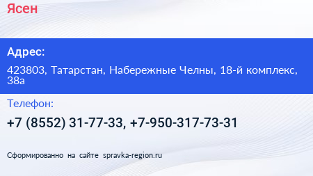 Ясен по адресу 423803, Татарстан, Набережные Челны, 18-й комплекс, 38а в дальнейшем Организация, размещена в следующих категориях:
