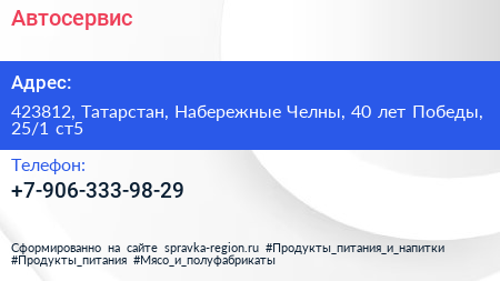 Автосервис по адресу 423812, Татарстан, Набережные Челны, 40 лет Победы, 25/1 ст5 в дальнейшем Организация, размещена в следующих категориях: