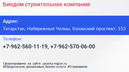 Биодом, строительная компания по адресу Татарстан, Набережные Челны, Казанский проспект, 153 в дальнейшем Организация, размещена в следующих категориях: