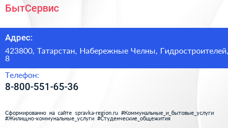 БытСервис по адресу 423800, Татарстан, Набережные Челны, Гидростроителей, 8 в дальнейшем Организация, размещена в следующих категориях: