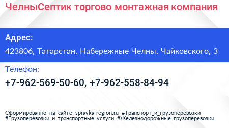 ЧелныСептик, торгово-монтажная компания по адресу 423806, Татарстан, Набережные Челны, Чайковского, 3 в дальнейшем Организация, размещена в следующих категориях: