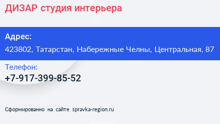 ДИЗАР, студия интерьера по адресу 423802, Татарстан, Набережные Челны, Центральная, 87 в дальнейшем Организация, размещена в следующих категориях: