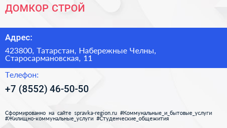 ДОМКОР СТРОЙ по адресу 423800, Татарстан, Набережные Челны, Старосармановская, 11 в дальнейшем Организация, размещена в следующих категориях: