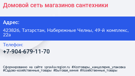 Домовой, сеть магазинов сантехники по адресу 423826, Татарстан, Набережные Челны, 49-й комплекс, 22а в дальнейшем Организация, размещена в следующих категориях: