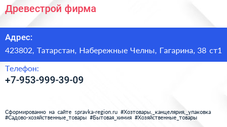 Древестрой, фирма по адресу 423802, Татарстан, Набережные Челны, Гагарина, 38 ст1 в дальнейшем Организация, размещена в следующих категориях: