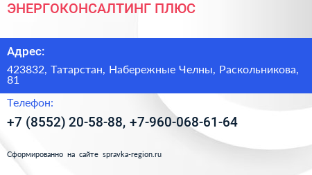 ЭНЕРГОКОНСАЛТИНГ ПЛЮС по адресу 423832, Татарстан, Набережные Челны, Раскольникова, 81 в дальнейшем Организация, размещена в следующих категориях: