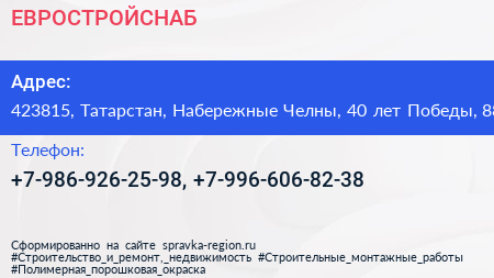 ЕВРОСТРОЙСНАБ по адресу 423815, Татарстан, Набережные Челны, 40 лет Победы, 88 в дальнейшем Организация, размещена в следующих категориях: