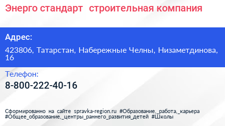 Энерго стандарт+, строительная компания по адресу 423806, Татарстан, Набережные Челны, Низаметдинова, 16 в дальнейшем Организация, размещена в следующих категориях: