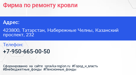 Фирма по ремонту кровли по адресу 423800, Татарстан, Набережные Челны, Казанский проспект, 232 в дальнейшем Организация, размещена в следующих категориях: