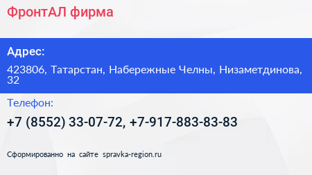 ФронтАЛ, фирма по адресу 423806, Татарстан, Набережные Челны, Низаметдинова, 32 в дальнейшем Организация, размещена в следующих категориях:
