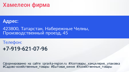 Хамелеон, фирма по адресу 423800, Татарстан, Набережные Челны, Производственный проезд, 45 в дальнейшем Организация, размещена в следующих категориях:
