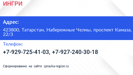ИНГРИ по адресу 423800, Татарстан, Набережные Челны, проспект Камаза, 22/3 в дальнейшем Организация, размещена в следующих категориях: