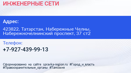 ИНЖЕНЕРНЫЕ СЕТИ по адресу 423822, Татарстан, Набережные Челны, Набережночелнинский проспект, 37 ст2 в дальнейшем Организация, размещена в следующих категориях: