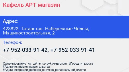 Кафель АРТ, магазин по адресу 423822, Татарстан, Набережные Челны, Машиностроительная, 2 в дальнейшем Организация, размещена в следующих категориях: