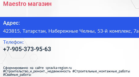 Maestro, магазин по адресу 423815, Татарстан, Набережные Челны, 53-й комплекс, 7а в дальнейшем Организация, размещена в следующих категориях: