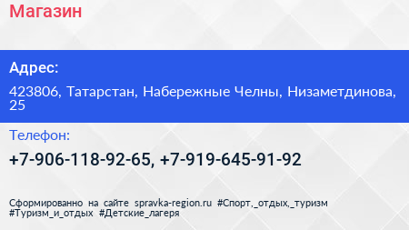 Магазин по адресу 423806, Татарстан, Набережные Челны, Низаметдинова, 25 в дальнейшем Организация, размещена в следующих категориях: