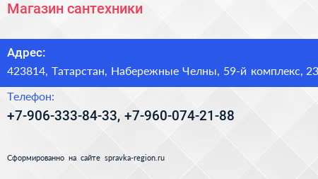 Магазин сантехники по адресу 423814, Татарстан, Набережные Челны, 59-й комплекс, 23 в дальнейшем Организация, размещена в следующих категориях: