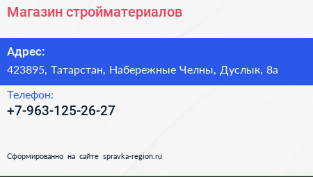 Магазин стройматериалов по адресу 423895, Татарстан, Набережные Челны, Дуслык, 8а в дальнейшем Организация, размещена в следующих категориях: