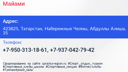 Майами по адресу 423825, Татарстан, Набережные Челны, Абдуллы Алиша, 35 в дальнейшем Организация, размещена в следующих категориях: