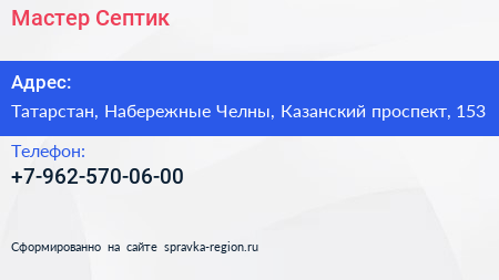 Мастер Септик по адресу Татарстан, Набережные Челны, Казанский проспект, 153 в дальнейшем Организация, размещена в следующих категориях: